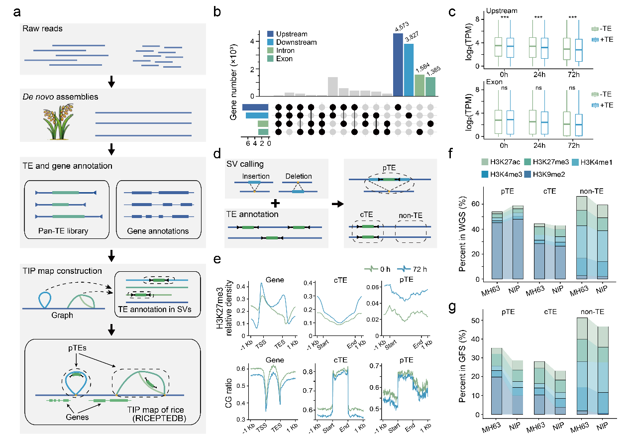 该研究以典型模式植物为对象,对10份具有温度适应多样性的水稻材料进行高质量基因组组装,并与已测序基因组整合,构建了图形泛基因组,绘制出覆盖30,316个多态性转座子的TIP图谱。进一步结合冷胁迫处理下的转录组和ChIP-seq、BS-seq等表观组数据,多态性转座子通过调控H3K27me3/H3K9me2组蛋白修饰及DNA甲基化重塑基因表达网络,介导植物冷胁迫响应(图1)。与传统SNP-GWAS相比,TIPs-GWAS方法对冷耐受性状的关联信号检测灵敏度显著提升,研究团队成功定位到两个关键耐冷基因(OsCACT和OsPTR),进一步通过CRISPR-Cas9基因编辑(敲除和过表达)及生理生化分析等实验验证其功能,邻近pTEs可能通过影响其表达水平或转录本结构,显著调控植株在低温胁迫下的存活率。